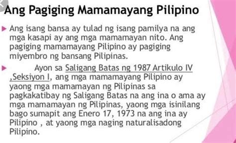 Ang pagkamamamayan ay isang mahalagang konsepto sa bawat bansa. Ito ay nagpapakita ng pagkakakilanlan at pakikipag-ugnayan ng isang indibidwal sa kanyang komunidad at sa bansa bilang kabuuan. Sa Pilipinas, ang pagiging mamamayan ay hindi lamang tungkol sa pagtanggap ng mga benepisyo at karapatan, ngunit ito rin ay may kasamang responsibilidad upang makatulong sa pagpapalakas at pagpapaunlad ng ating bansa.